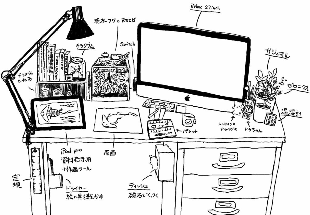 1990年大阪府吹田市生まれ。2017年 『うみがめぐり』(仮説社)でデビュー。生物なら時代や種類を問わず、古生物の復元画や、微生物でも大きな動物でもなんでも描く。家族と犬とフグとエビとアリと暮らしている。
